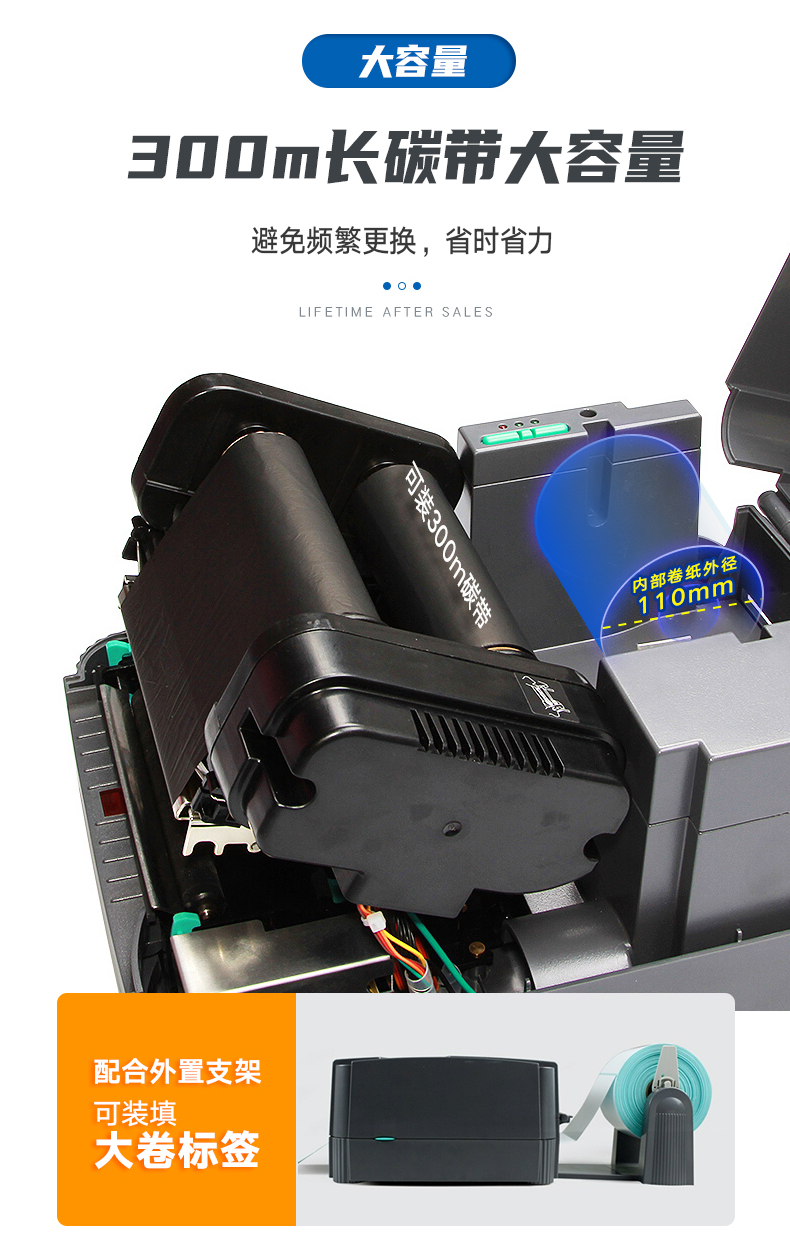 秉持TSC对于产品品质的坚持,TTP-244 Pro除了延续使用TSC独特的”双马达设计”,有效延长机器使用寿命外,硬体规格全面升级;搭配可容纳300公尺碳带及70公尺内部纸卷的超大容量机构设计,让您更有效率的完成每项列印任务。