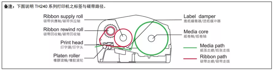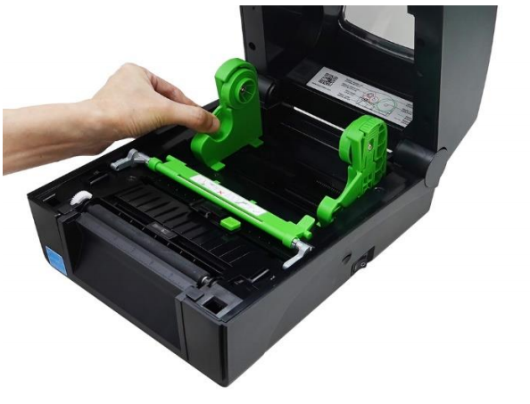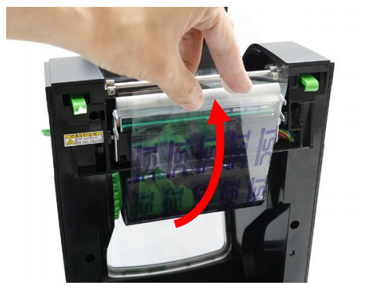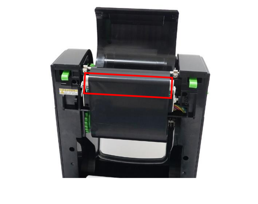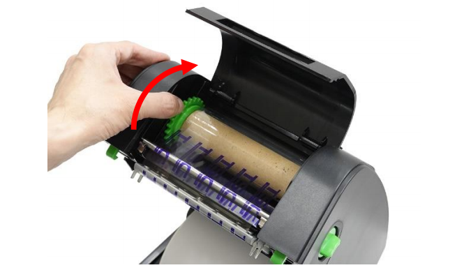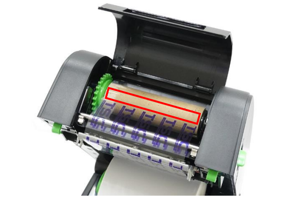 10.继续转动碳带回收轴齿轮,直到碳带完全超过打印头(如以下所),并确认碳带没有任何皱褶。