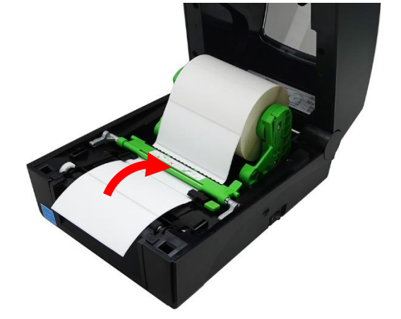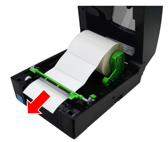 6. 拉出标签并将标签从缓冲器下方穿过, 标签前端需要超过打印机前 侧盖板。