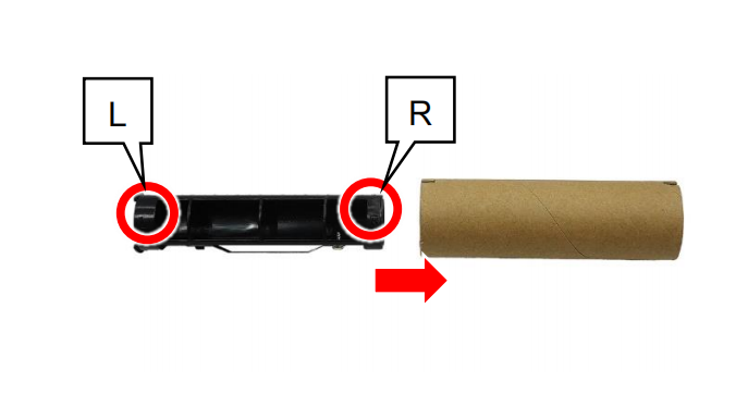 4. 将空纸卷轴右侧压入附弹簧的回收轴心,然后将空纸卷回收轴左侧 压入附齿轮的回收轴心。确认空纸卷左侧的凸起与齿轮中央的凹处 有确实结合。